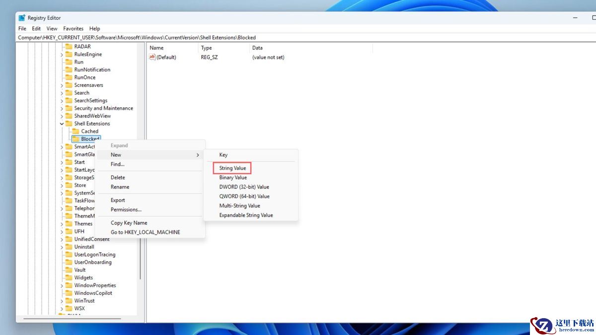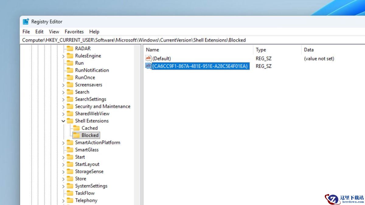 最后,在 Blocked 项中新建一个字符串值,并将其名称设置为 {CA6CC9F1-867A-481E-951E-A28C5E4F01EA}。