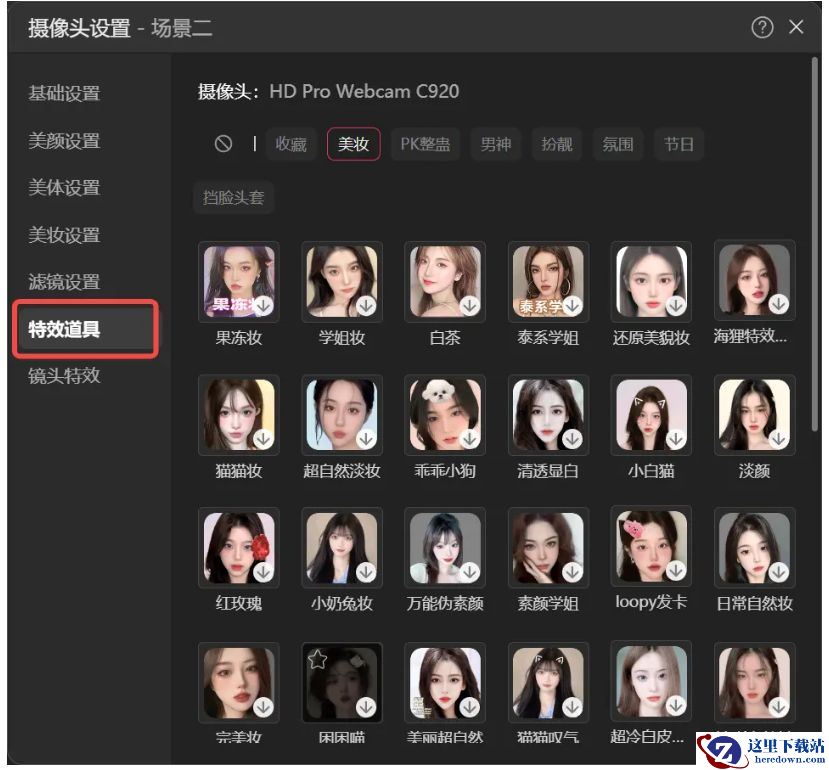 点击摄像头设置→特效道具,这里可以根据您的需求选择美妆特效、整蛊特效等特效道具。