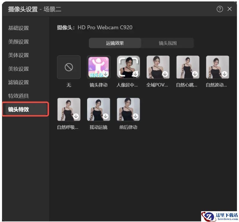点击摄像头设置→镜头特效,这里可以根据您的需求选择运镜效果和镜头氛围。