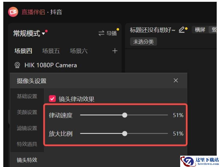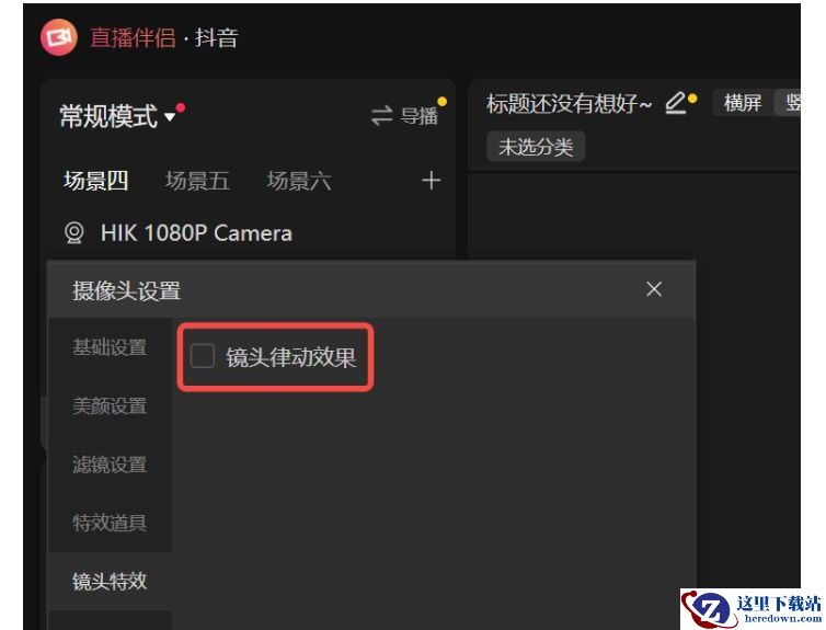 1、打开摄像头设置页面,在镜头特效栏中勾选“镜头律动效果”,即可生效