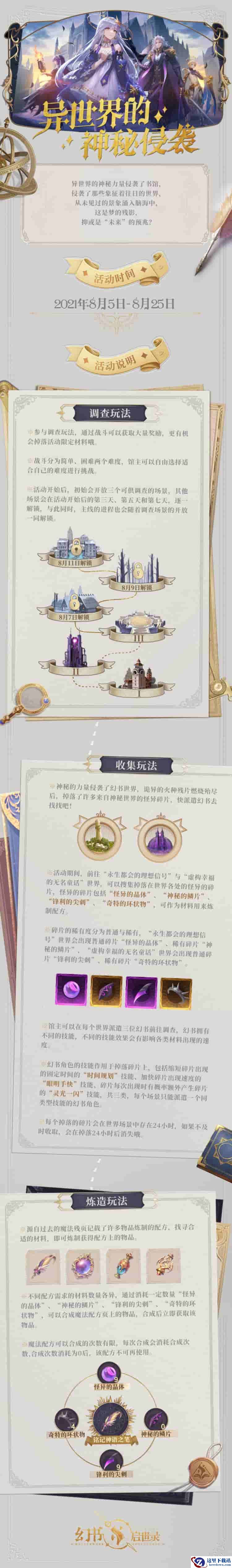 8月5日至8月25日期间,限时活动“异世界的神秘侵袭”与新主线剧情同步展开,活动开启调查玩法,馆主们通过调查可获取大量奖励和几率掉落的限定活动材料,助力馆主和幻书们的成长。