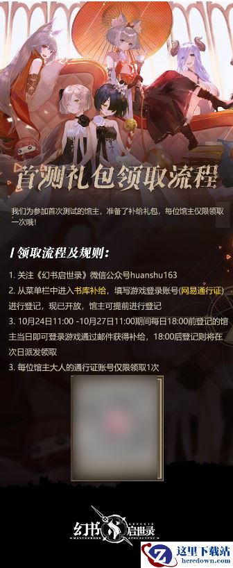 开启幻书世界的冒险怎能没有福利相助!馆主大大们只要关注《幻书启世录》微信公众号“huanshu163”,从菜单栏进入“书库补给”,填写游戏登录账号(网易通行证)进行登记,就可以在10月24日至10月27日的测试期间通过游戏内邮件获得补给。本次测试中,每位馆主大大的通行证账号仅限领取1次哦!