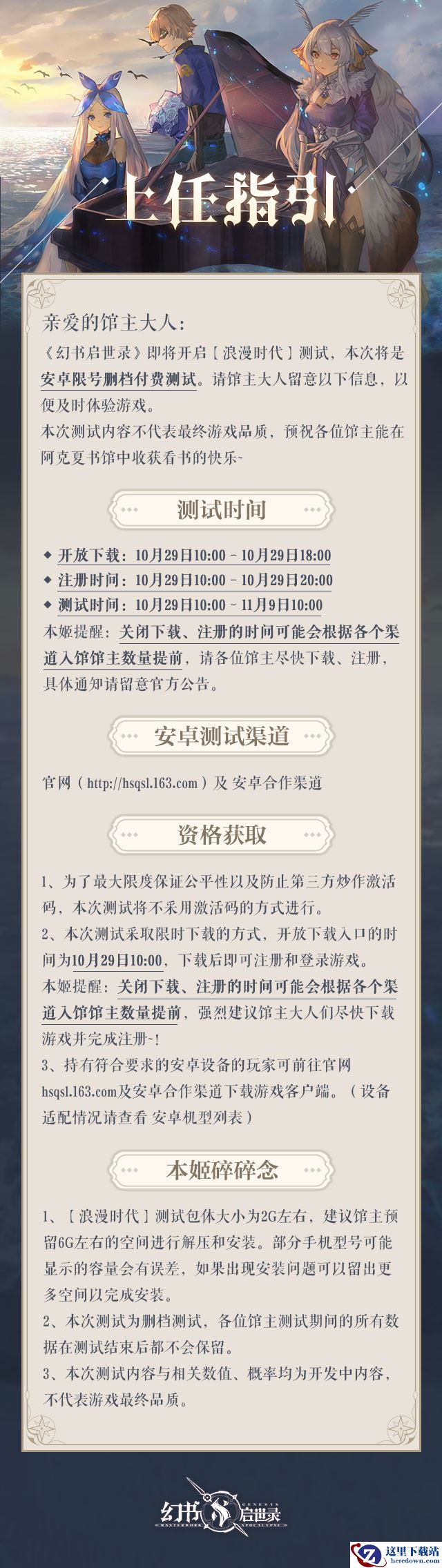 本次浪漫时代测试为安卓限号删档付费测试,今日10:00,各位馆主可前往游戏官网https://hsqsl.163.com/或其他安卓合作渠道,进行下载及注册。需要提醒馆主的是,本次采取限时下载的方式,关闭下载及注册的时间,会根据各个渠道进入馆主的数量提前,请馆主一定要尽快操作!