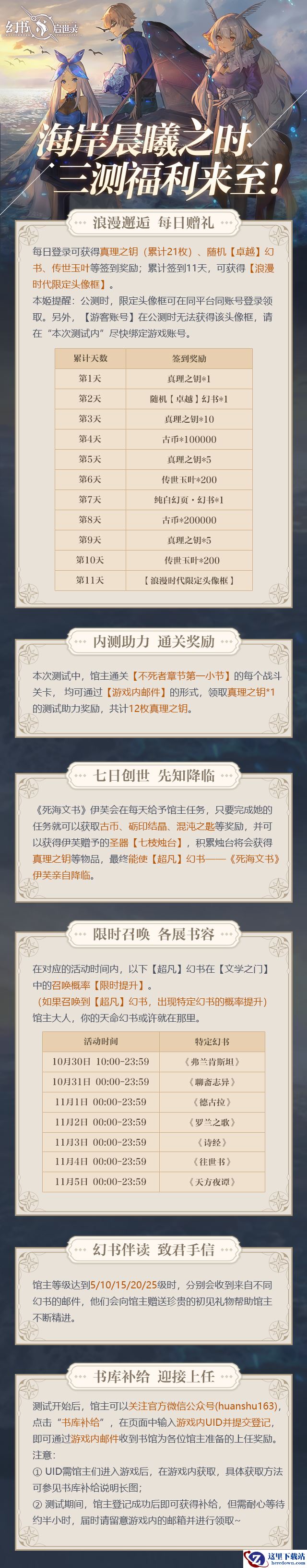 本次测试,还为馆主准备了超多三测福利,每日登录即可获得真理之钥、随机【卓越】幻书、传世玉叶等签到礼,累计签到11天,还可获得浪漫时代限定头像框!