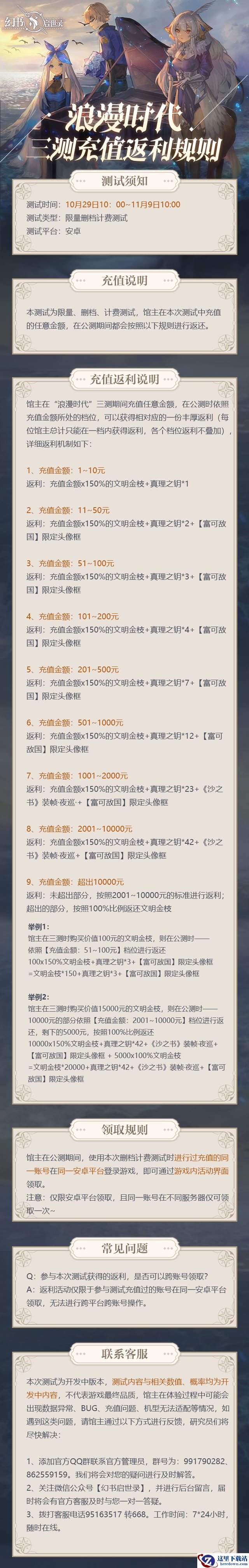 馆主在浪漫时代测试期间充值任意金额,公测时可获得相应档位的充值返还,详细返利规则如下!
