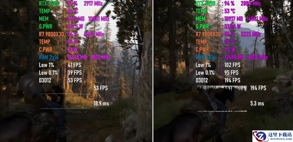 以下将分别测试七款游戏,均采用1440P画质模式,以下系列图片中左边代表GeForce RTX 5050平台,右边代表GeForce RTX 5090平台。