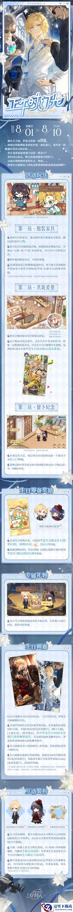 8月1日更新后 - 8月10日05:00,参与罗夏生日活动「正午时幻光」,可免费获得1张生日纪念画灵[夏意葱茏]、生日Q版画灵[情梦佳期]及生日情侣头像等奖励。
