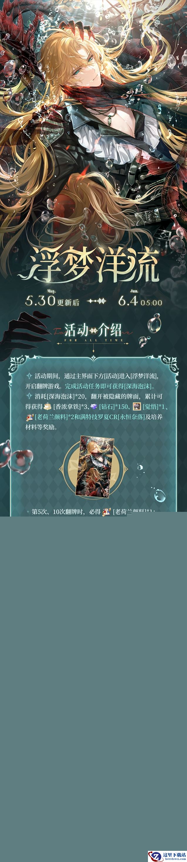 5月30日更新后 - 6月4日05:00,通过主界面下方[活动]进入「浮梦洋流」。完成活动任务或购买礼包获取[深海泡沫],消耗[深海泡沫]翻开被隐藏的牌面,可得[钻石]、[觉悟]、[老荷兰颜料]和罗夏CR[永恒奈落]等奖励。