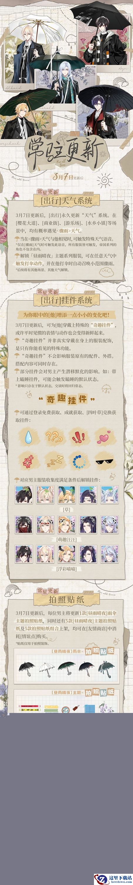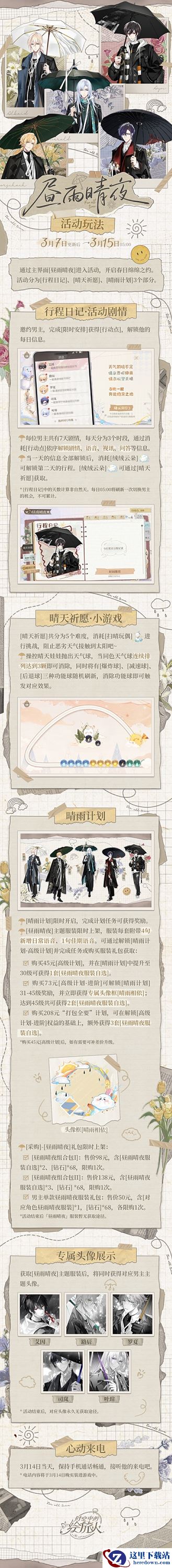 3月7日更新后 - 3月15日05:00,全新活动「昼雨晴夜」主题服装上架。获取服装后,将同时获得对应男主的专属头像。