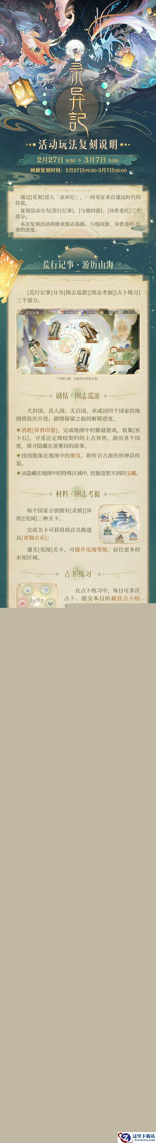 2月27日09:30 - 3月7日05:00,通过[主界面]-[花架]进入[录异记]。
