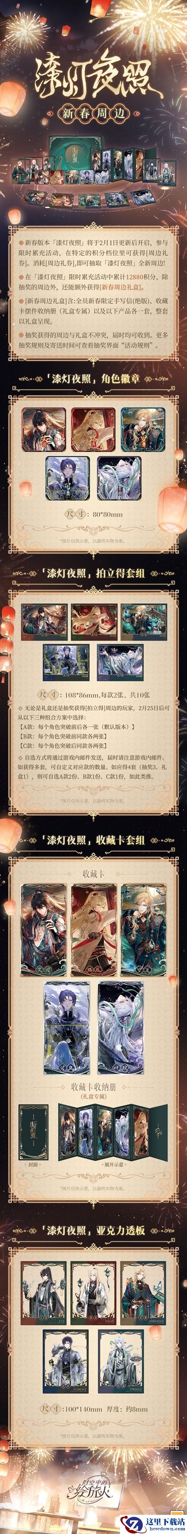 活动期间,累计充值达对应积分,可得路辰SSR[遇楼兰]、[老荷兰颜料]、[周边礼券]等奖励。消耗[周边礼券],即可抽取「漆灯夜照」全新周边;限时充值活动累计12880积分,可获得[春节周边礼盒]。