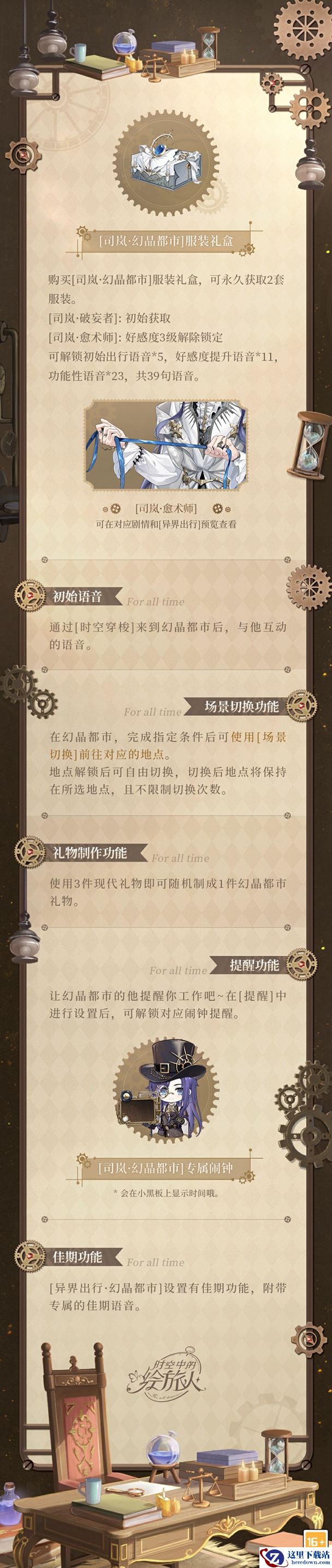 购买[司岚·幻晶都市]服装礼盒,可永久获得[司岚·破妄者]、[司岚·愈术师]两套服装。[司岚·愈术师]初始暂时锁定,好感度提升至3级时解锁。