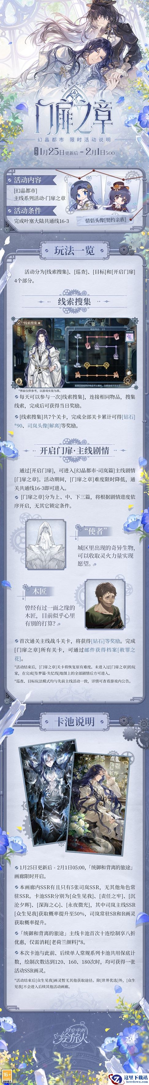 《时空中的绘旅人》「幻晶都市」全新主线司岚篇[门扉之章]将于1月25日更新后开启。接连往今,虚实浮沉,启封矗立的门扉,探求未来的可能。