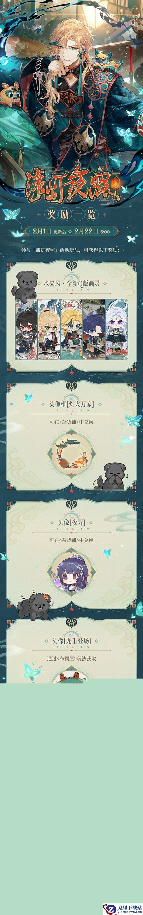 2月1日更新后 - 2月22日05:00,「漆灯夜照」卡池、许愿功能限时开启。活动期间,艾因SSR[执迷蛊心]、路辰SSR[冥逢幽路]、罗夏SSR[尽处天光]、司岚SSR[六出诡事]、叶瑄SSR[人间不识]获得概率提升。