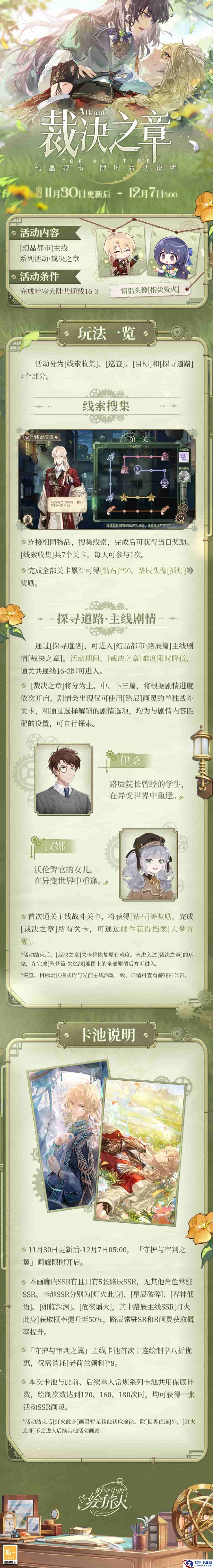 11月30日更新后 - 12月7日05:00,全新主线「幻晶都市·裁决之章」正式开启,从[主界面]下方进入[裁决之章]。