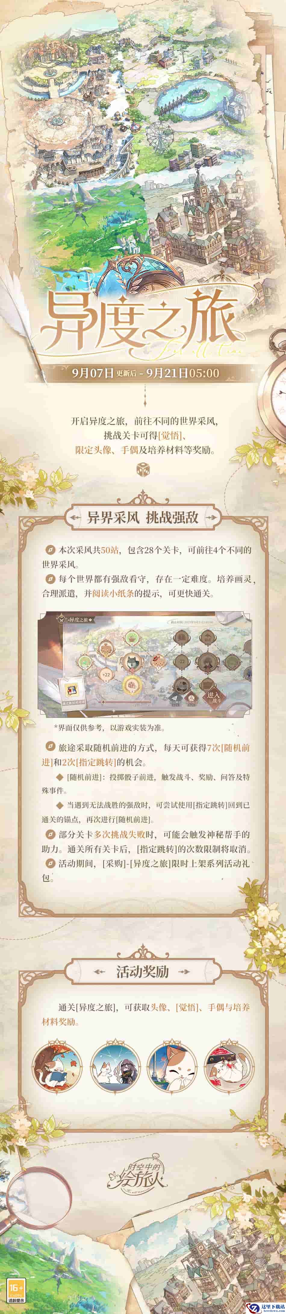 9月7日更新后 - 9月21日05:00,全新采风活动「异度之旅」开启,参与活动可得限定头像、[觉悟]等珍贵奖励,首次通过第35站可获手偶[自己·原初血脉]。