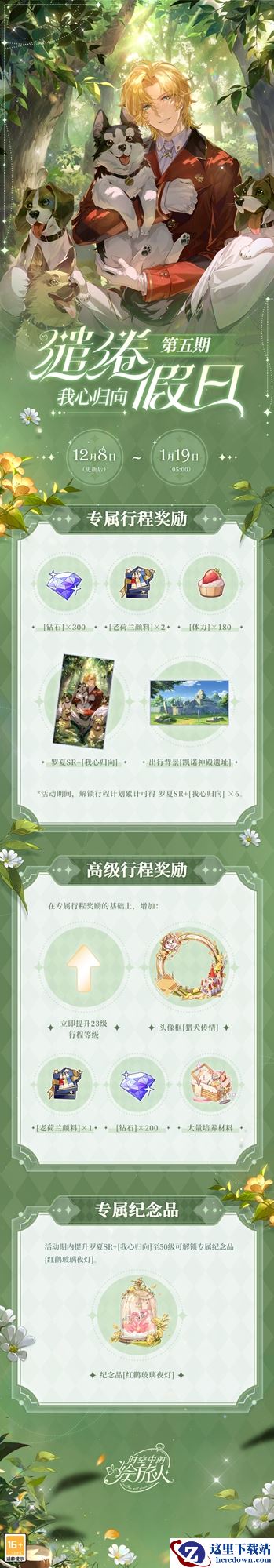 12月8日更新后,「缱绻假日·第五期」开启。活动内容包括[假日清单]和[假日计划],通过完成任务提升计划进度可获取奖励。解锁[专属行程]或[高级行程],可在不同计划等级获得罗夏SR+画灵[我心归向]等丰富奖励。