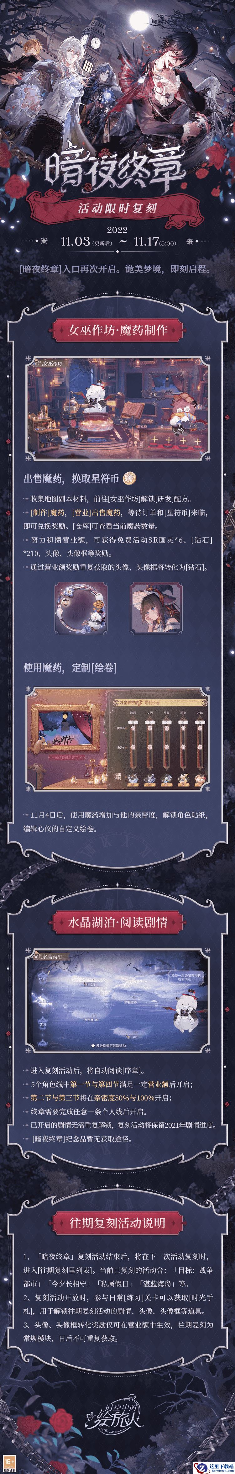 11月3日更新后 - 11月17日05:00,点击[花架]-[暗夜终章]可进入活动复刻玩法。复刻活动开启后,前往[水晶湖泊]查看活动剧情,部分剧情满足一定条件后开启。收集地图副本材料,前往[女巫作坊]研制魔药,经营作坊赚取[星符币]。