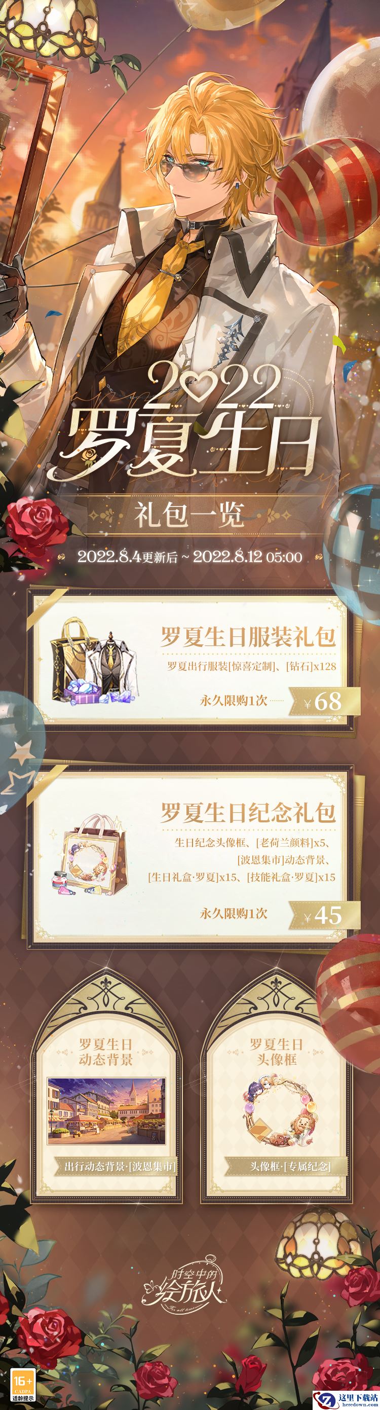 活动期间,全新罗夏生日服装礼包上架商城,售价68元,内含罗夏生日出行服装[惊喜定制]及[钻石]*128。