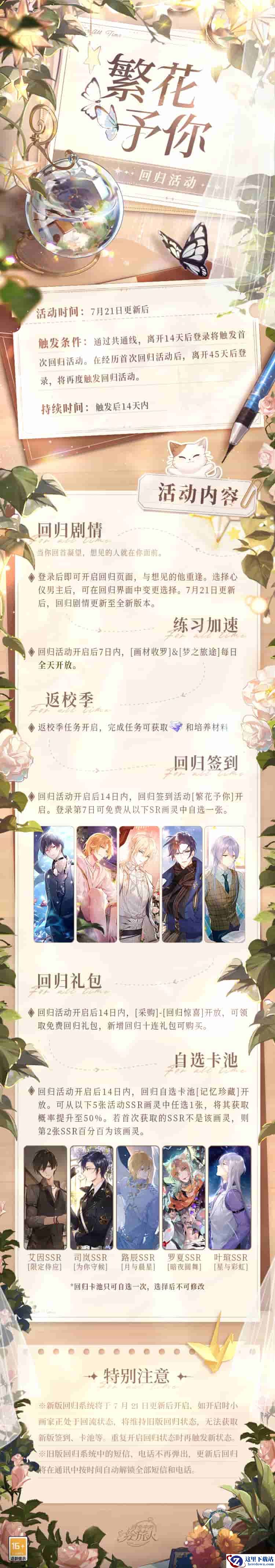 《时空中的绘旅人》将于7月21日更新后进行[回归活动]内容迭代。回归玩家登录游戏即可体验全新回归剧情,参与签到、完成回归任务可获得[钻石]、[自选SR画灵]及培养材料等丰厚奖励。[采购]商城上架回归礼包,[记忆珍藏]自选卡池限时开放。