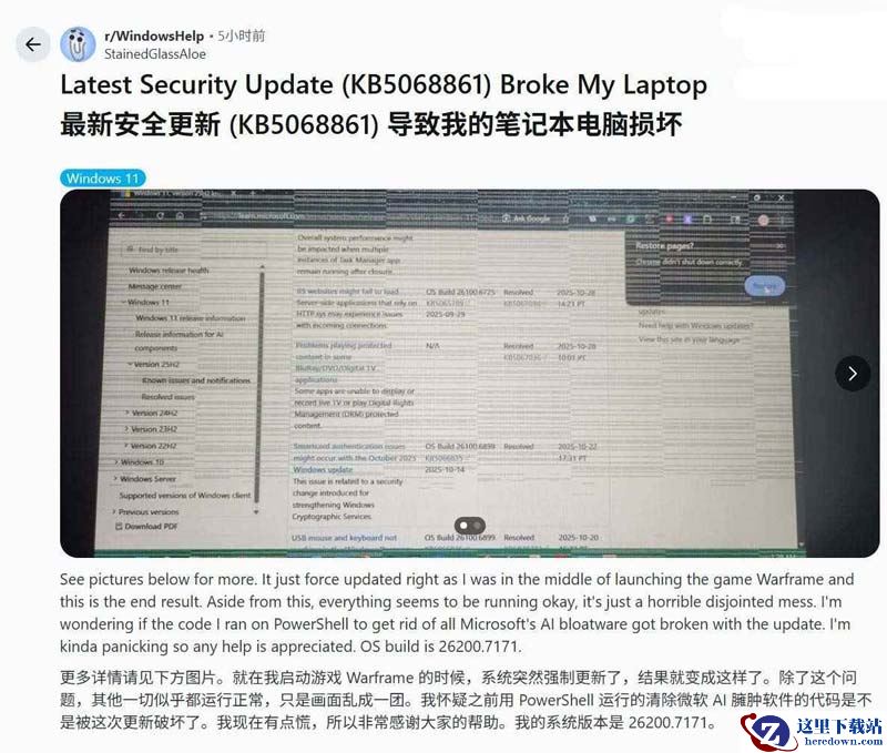 用户 StainedGlassAloe 在 Reddit 论坛表示,他用笔记本电脑玩《星际战甲》时被自动安装了 KB5068861 补丁,随后电脑开始出现黑屏、亮度无法调整等异常现象,且他并没有点击过安装更新按钮,就算卸载掉更新,电脑也会在重启时又自动装回去。