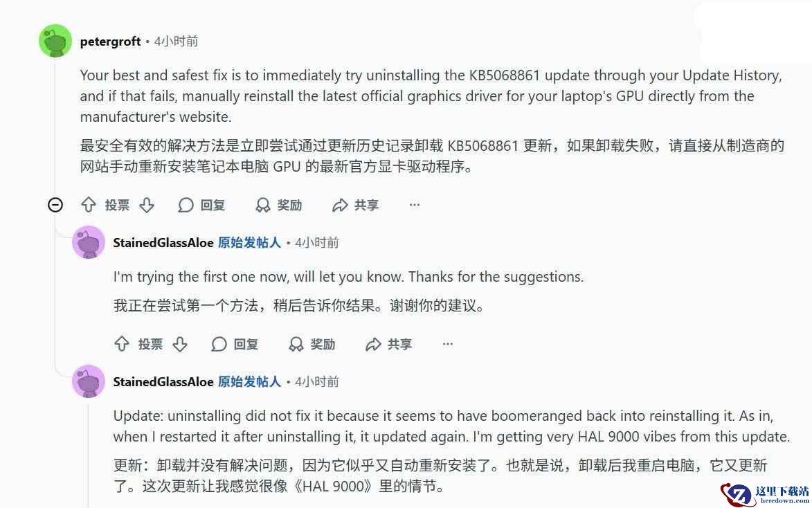 有用户在评论区建议他从显卡制造商官方下载驱动重新安装,但尝试后问题依旧存在,同时该更新还会在每次重启后自动重装,几乎无法彻底删除。