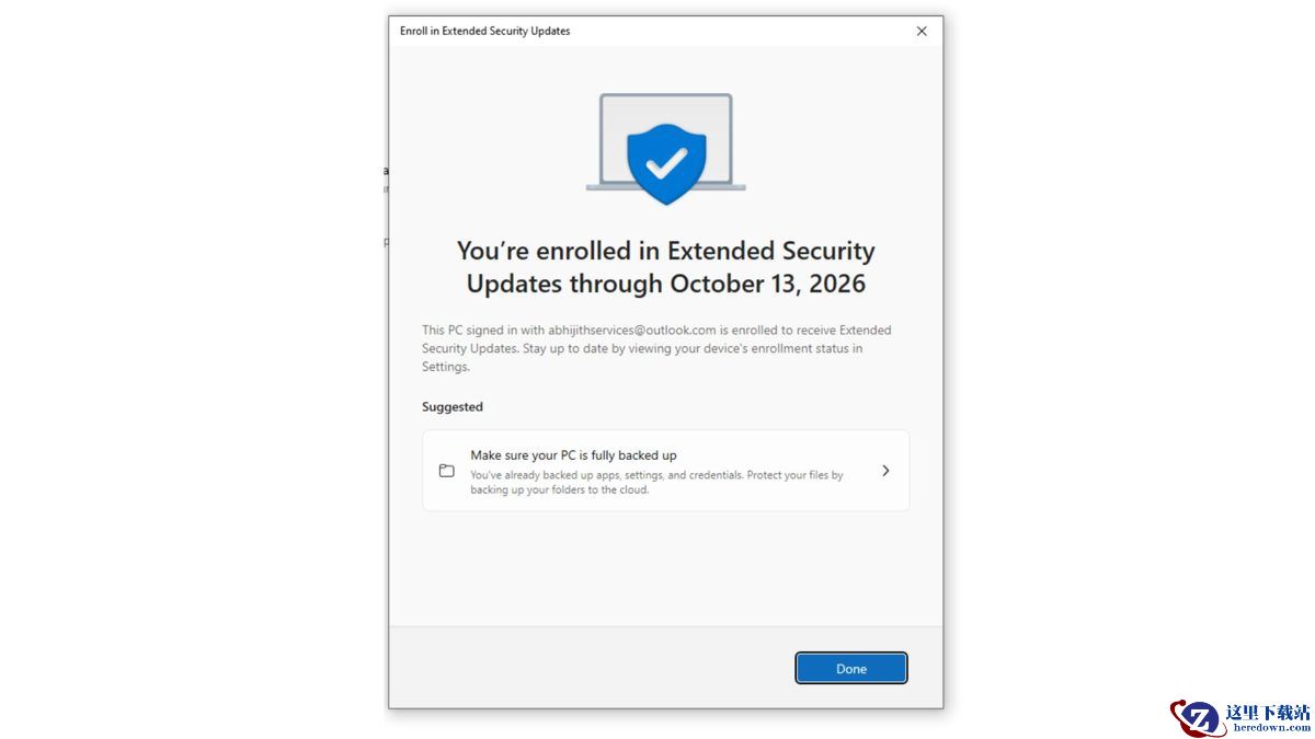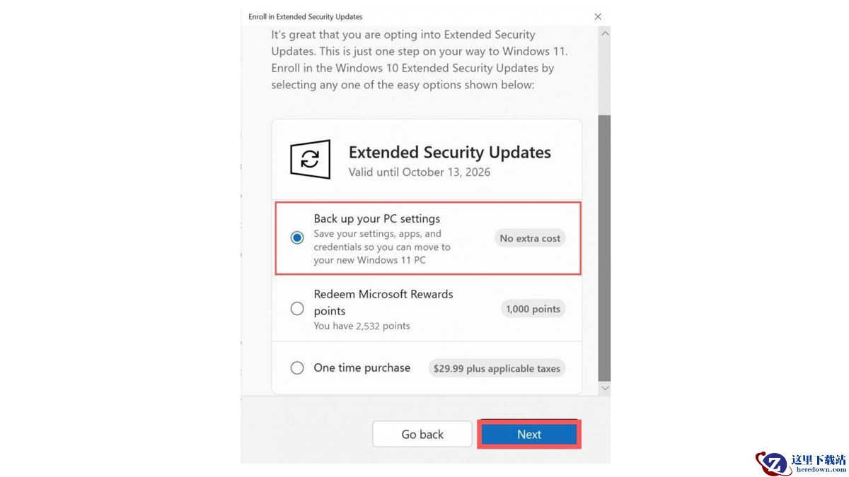 在跳出来的弹窗中,用户可以选择第一个选项,选择备份当前 PC 设置,微软在注释中写道:“该选项会保存您的设置、应用和凭据,以便迁移到新的 Windows 11 电脑”。用户可以选中它并单击“下一步”,几秒钟后,微软将显示您已注册扩展安全更新。