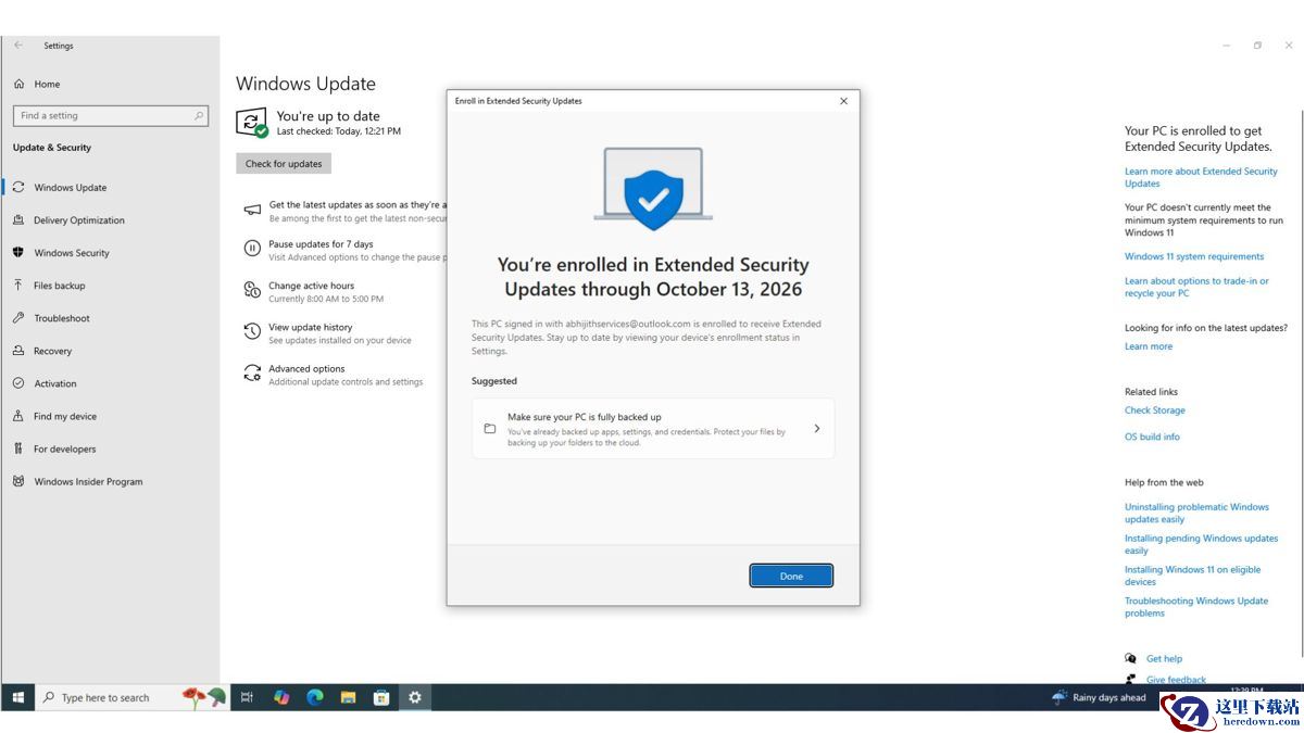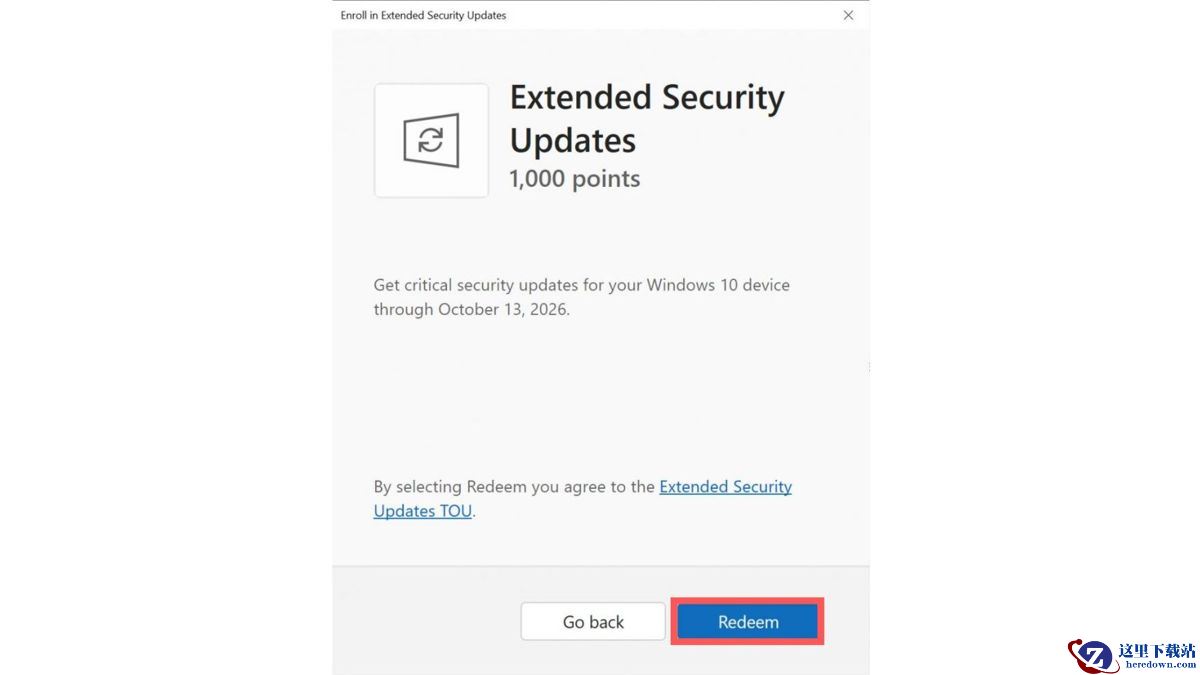 用户点击“立即注册”按钮,然后选择“兑换 Microsoft Rewards 积分”选项,将看到一个窗口,显示您可以获得 Windows 10 电脑的关键安全更新,有效期至 2026 年 10 月 26 日。点击“兑换”,几秒钟后即可注册 ESU。