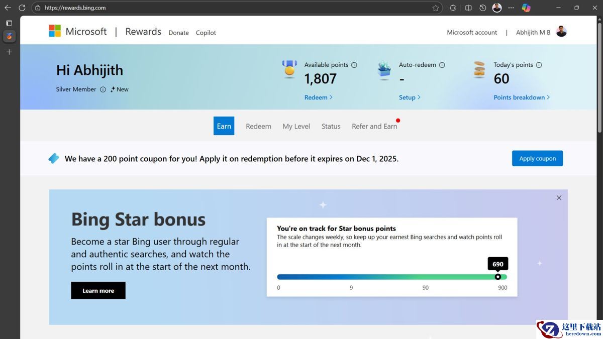 用户可以访问 rewards.bing.com 网站,查看其 Microsoft 账户中有多少奖励积分。如果你的微软账户是新开的,你可能需要几周甚至几个月的时间才能积累到 1000 点微软奖励积分。