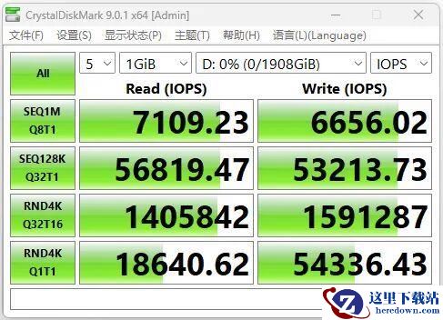 ▲以IOPS为单位显示的致态TiPlus7100s固态硬盘2TB CrystalDiskMark测试成绩