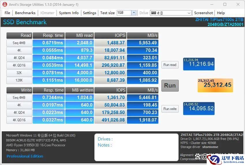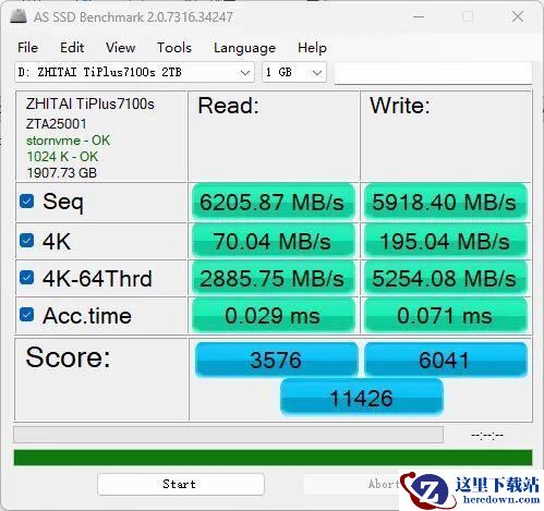 而在AS SSD Benchmark、Anvil's Storage Utilities测试中,致态TiPlus7100s固态硬盘2TB也创造出漂亮的成绩。比如其AS SSD Benchmark总分达到11426分,成为少数能在该测试中成绩过万的PCIe 4.0固态硬盘。大部分PCIe 4.0产品的成绩在10000分以内,性能较好的中高端产品成绩在8000~10000分之间,只有定位更高的PCIe 5.0固态硬盘才能轻松突破10000分大关。