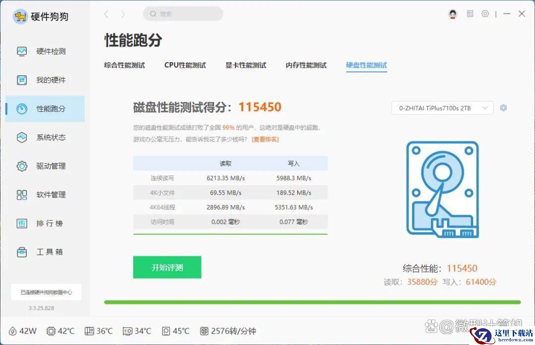 ▲在《硬件狗狗》磁盘性能测试中,致态TiPlus7100s固态硬盘2TB的成绩则能赢下全国99%的用户。