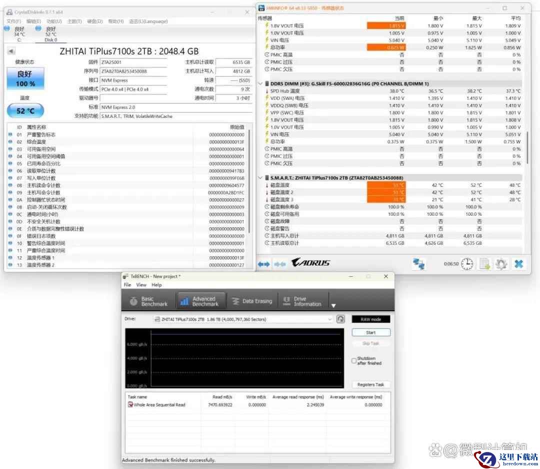 ▲致态TiPlus7100s固态硬盘2TB的CrystalDiskMark测试成绩