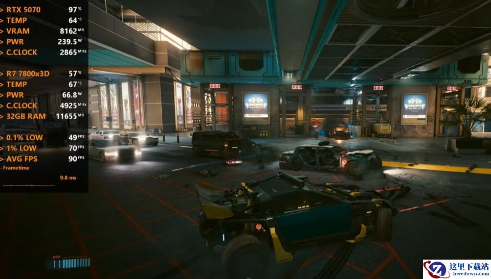 平均帧速为90 FPS,最低瞬时帧速为70 FPS,帧时间为9.8ms,CPU使用率为57%,功耗为67W,温度为67℃,内存使用量为11.7GB,GPU使用率为97%,显存使用量为8.2GB,功耗为240W,温度为64℃。