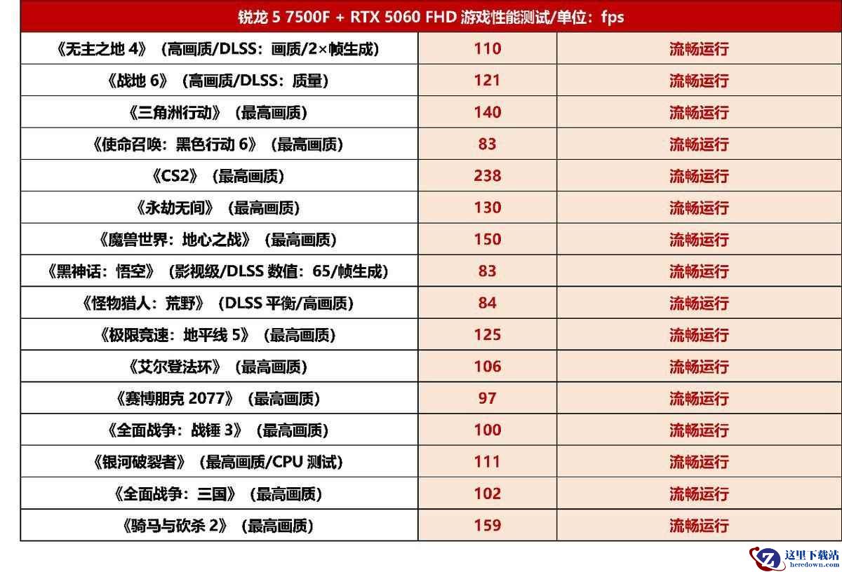 其他的游戏大作的表现可以查阅上面的表格描述。可以看到,在FHD分辨率和适当的设置下,锐龙5 7500F + RTX 5060是完全可以保证通吃主流游戏大作的,即便是要求很高的大作,也有办法实现百帧畅玩,主流游戏玩家可以放心入手。