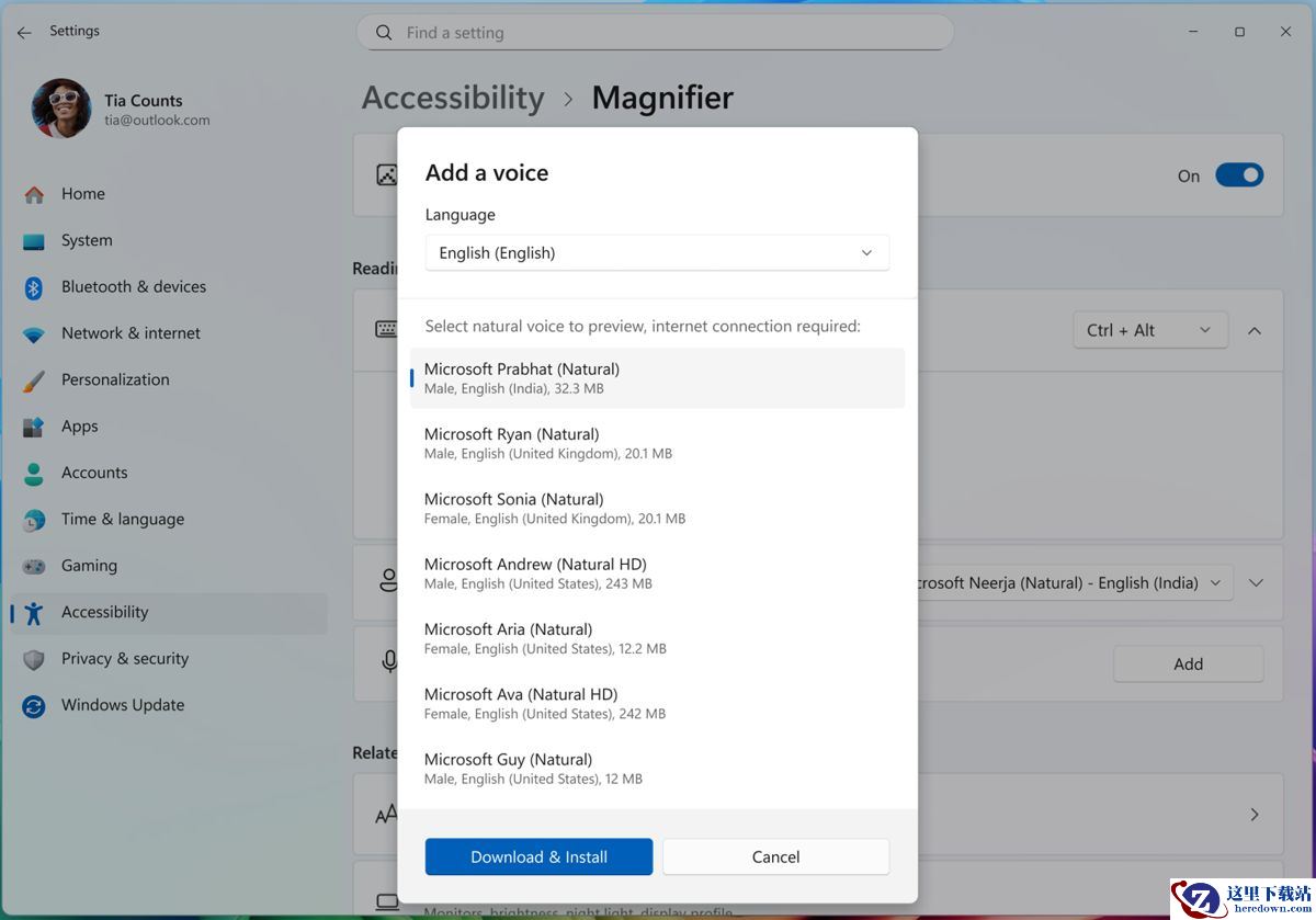 设置 → 辅助功能 → 放大镜.导航到“添加自然语音”按钮下载您偏好的
