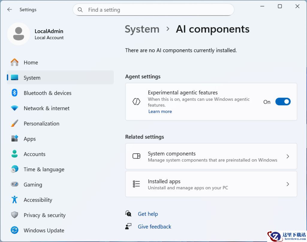 系统设置中也新增实验性的“AI 智能体”功能开关,位于 System → AI Components,可用于允许系统使用最新的 Windows agentic 功能。