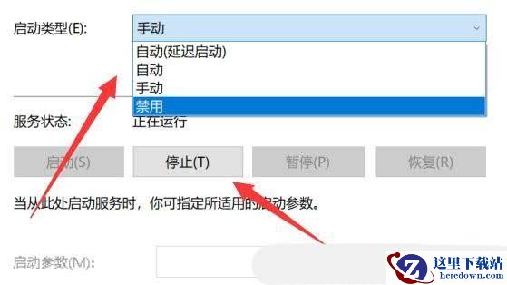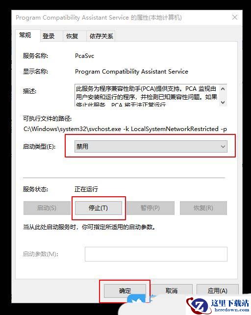 4、Program Compatibility Assistant Service窗口,将启动类型修改为禁用,并点击停止;