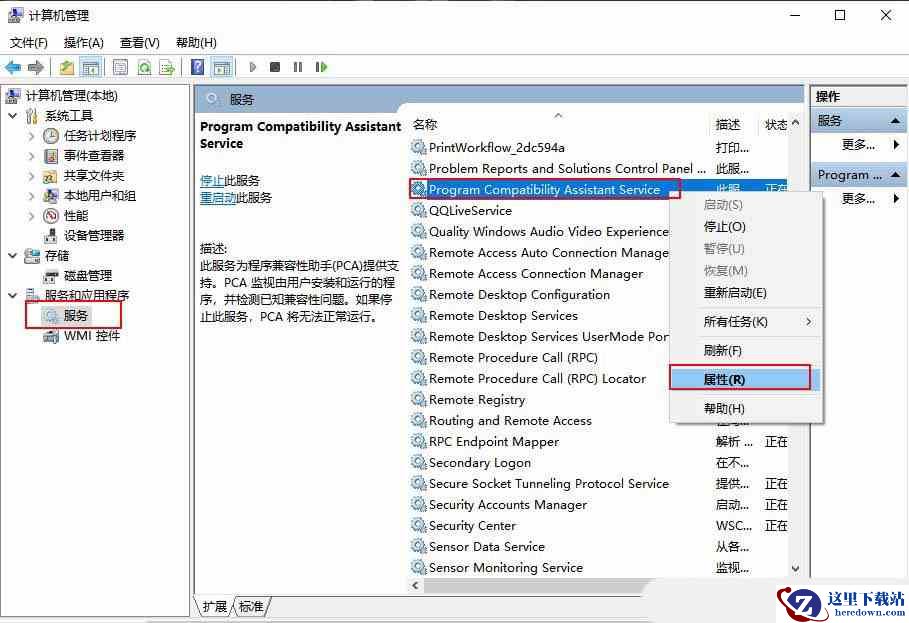 2、计算机管理窗口中,点击展开左侧的服务和应用程序下的服务,再在右侧窗口中找到 Program Compatibility Assistant Service 这项服务,在该服务名称上点击右键,在打开的菜单项中,选择属性;