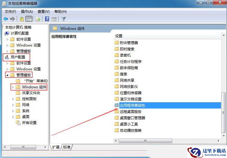2、接着,在打开的界面中,依次点击展开“用户配置-管理模板-Windows组件-应用程序兼容性”。