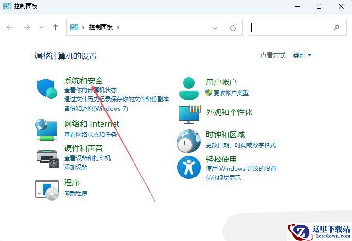 1、首先,打开系统的控制面板界面,选择打开“系统和安全”设置。