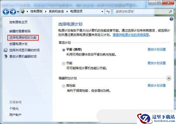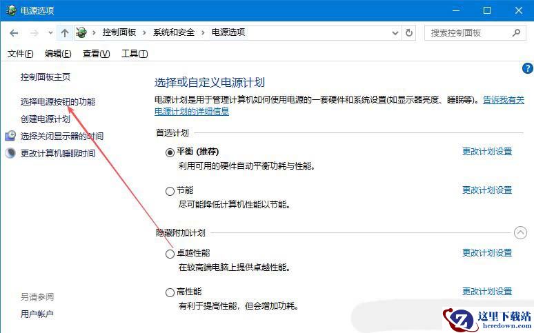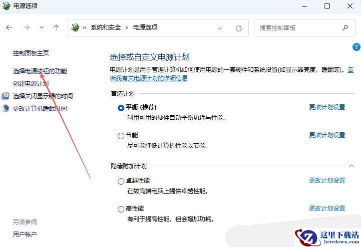 3、然后,点击左侧的“选择电源按钮的功能”选项。