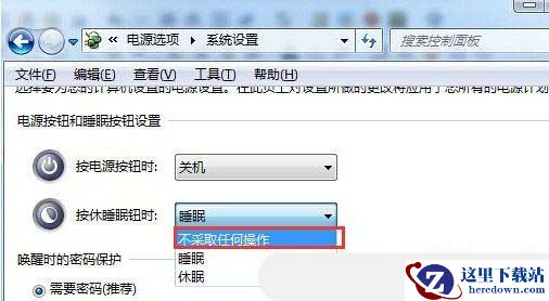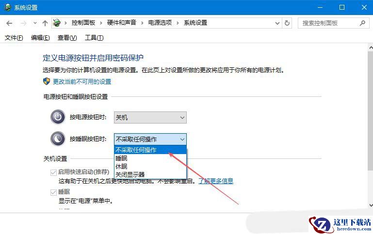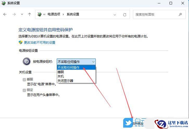 4、随后,找到下方的“按休眠按钮时”,设置为“不采取任何操作”,再点击“保存修改”即可。