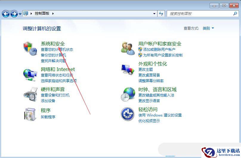1、首先,打开Win7系统的控制面板界面,选择打开“系统和安全”设置。