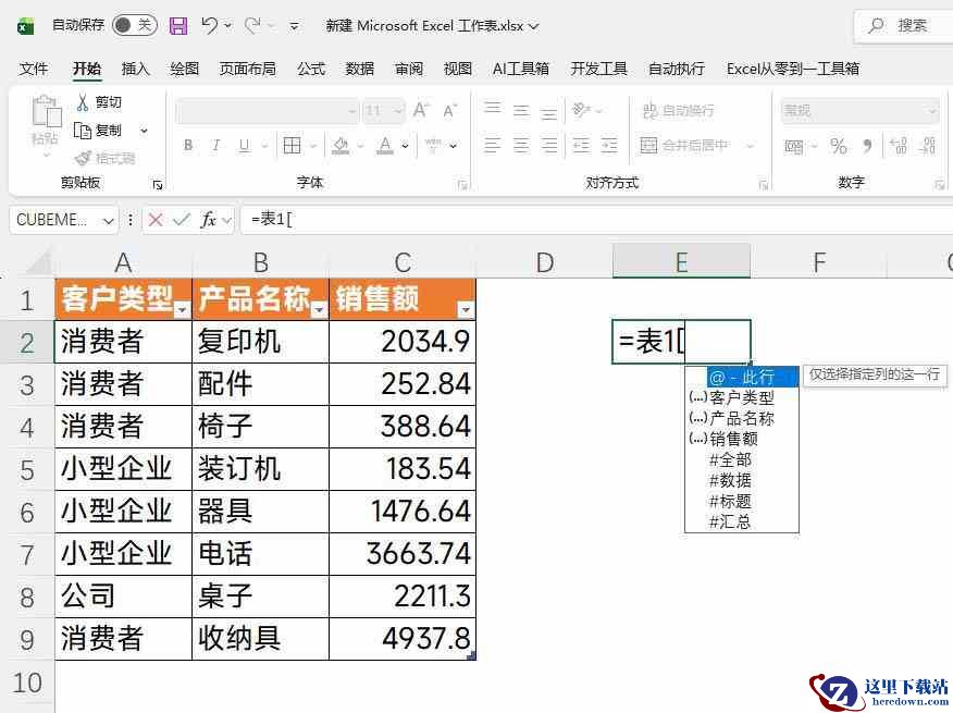 我们只需要输入超级表的名称,然后输入一个左侧的方括号就会显示很多内容,如下图,我们选择【客户类别】,就可以引用到整行的数据,这个就是它特殊的引用方式