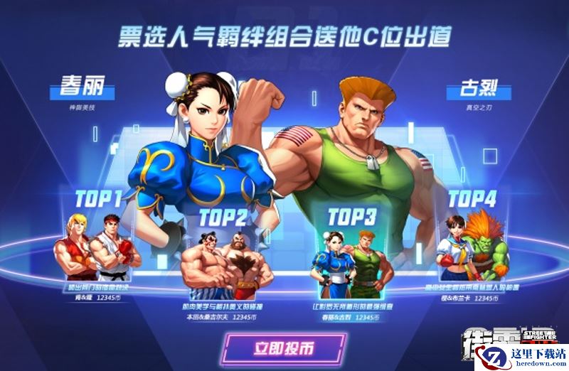 在格斗家共创培养计划中,玩家可以为自己喜欢的羁绊组合“立即投币”。师出同门的宿命对决,“阿多根”的肯和“耗油根”的隆,是不是你最中意的组合?亦或是春丽&古烈的蓝绿CP组合,让你觉得更应该C位出道?樱&布兰卡、本田&桑吉尔夫,亦或是他们是获得你足够认同感的战斗伙伴?参与票选人气CP活动,不仅可以送他们C位出道,还可以领取包括限定头像框在内的丰富奖励。