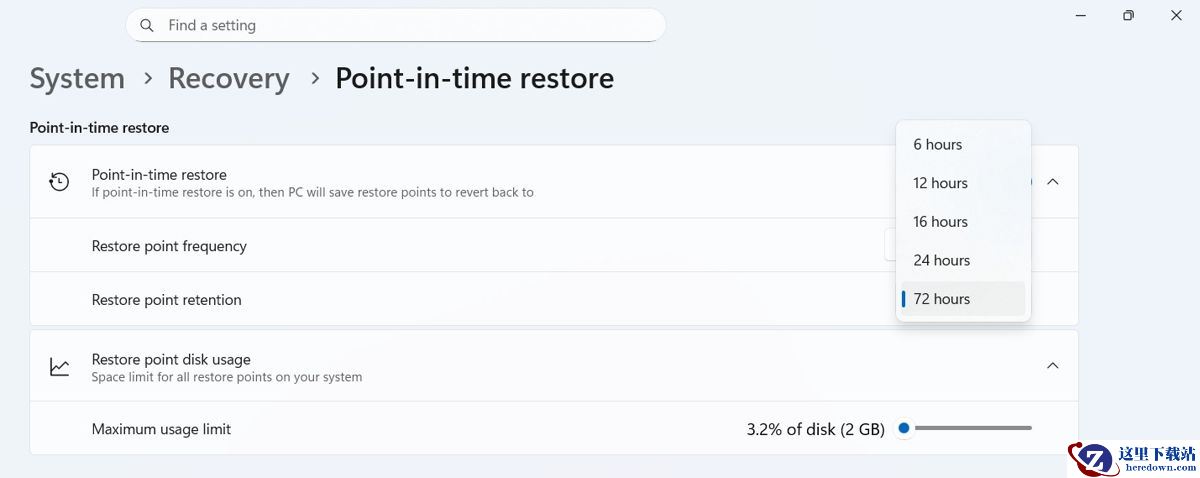 功能开启后,用户可以自定义还原点的创建频率(4 至 24 小时)和保留时长(6 至 72 小时)。值得注意的是,微软设定了一个硬件门槛:只有当电脑总磁盘空间不小于 200GB 时,该功能才会被默认开启。