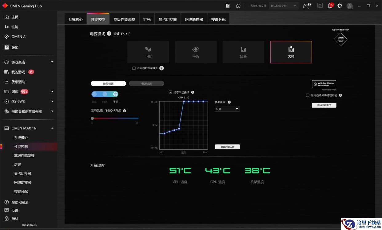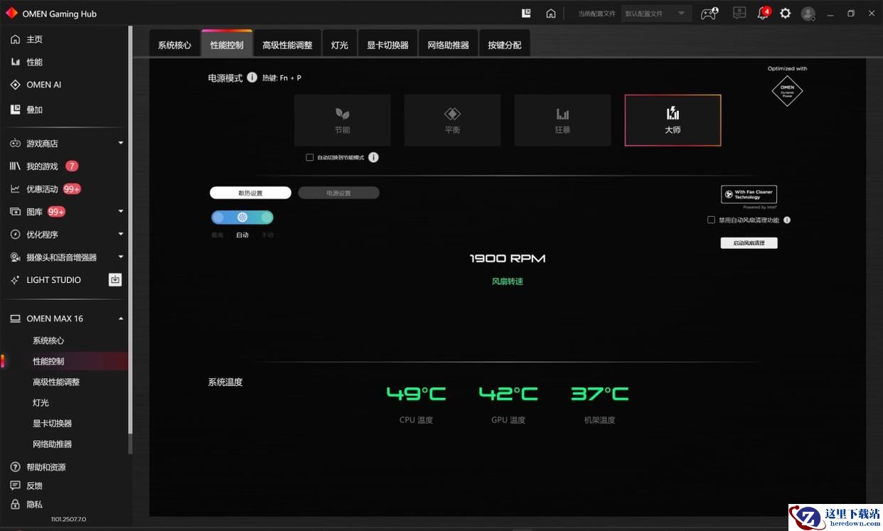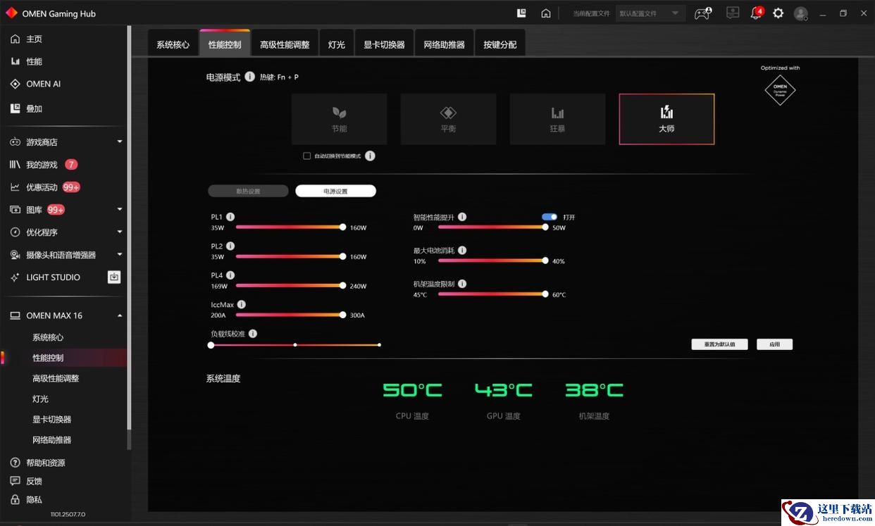 CPU:Ultra 9 275HXGPU:RTX 5080 Laptop GPU内存:32GB双通道 DDR5 5600MHzSSD:SK Hynix PCB01 1TB屏幕:2560*1600/100%sRGB/240Hz打开Omen Gaming Hub后,在性能控制选项中便可以看到大师模式的入口。进入大师模式后有两个选项,“散热设置”和“电源设置”。