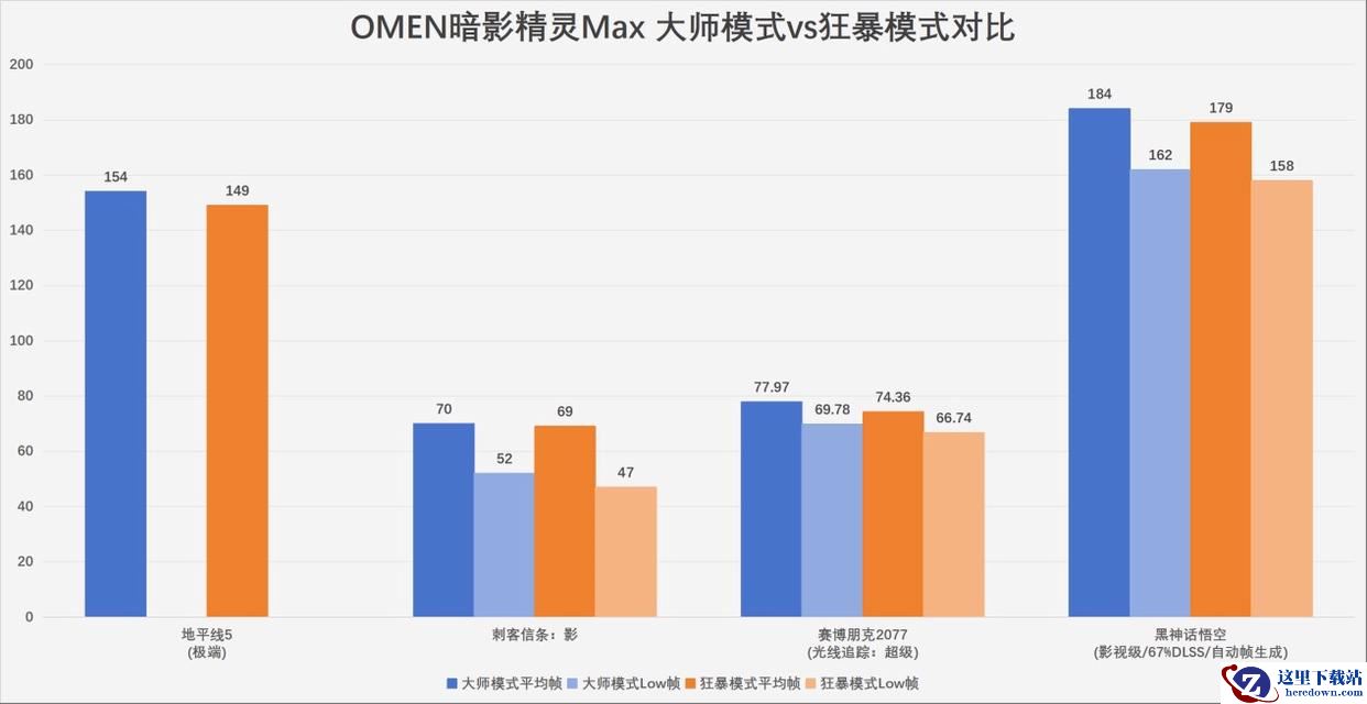 当然本文着重于大师模式。其实对于大部分用户来说,狂暴模式,就可以满足大部分的重负载场景,并通过智能的功耗分配,也可以达到OMEN暗影精灵MAX的最高250W的满功耗性能,广大用户可以按需选择。