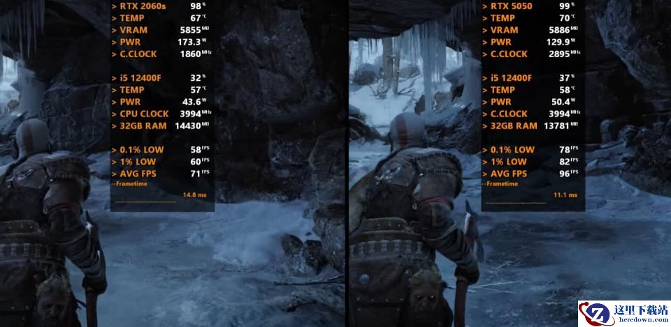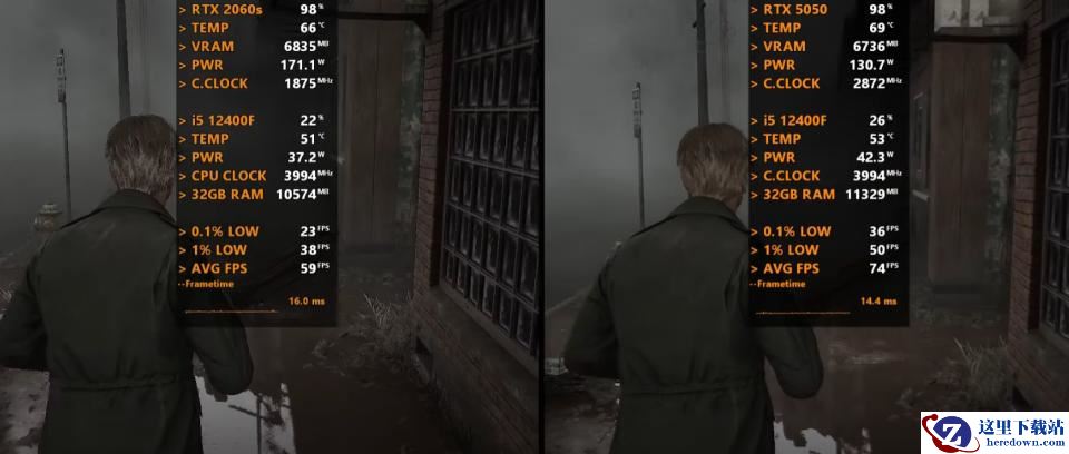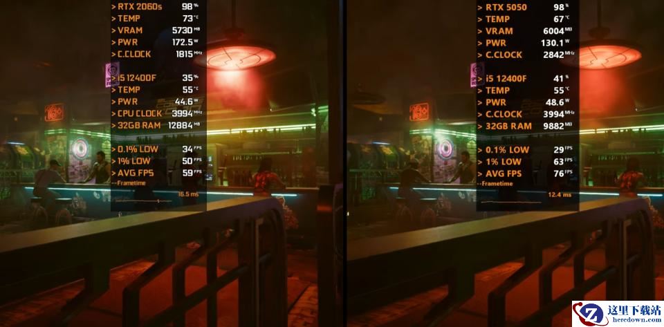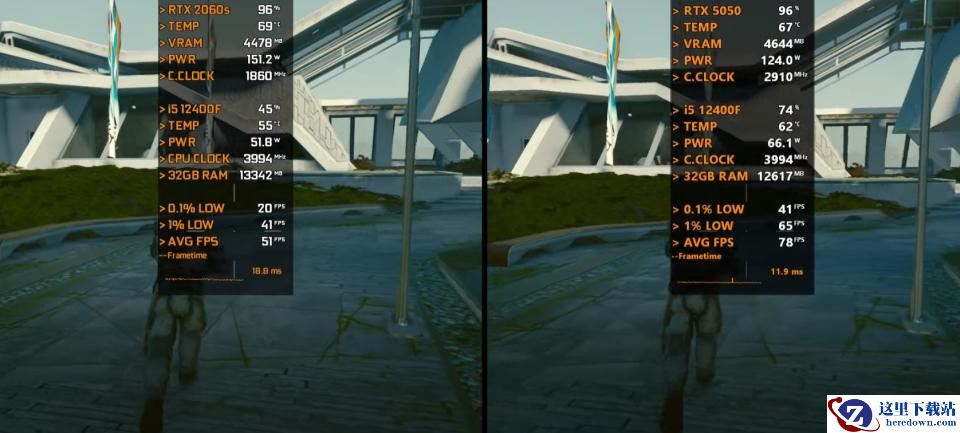 以下将分别测试七款游戏,均采用1080P画质模式,以下系列图片中左边代表GeForce RTX 2060 SUPER平台,右边代表GeForce RTX 5050平台。